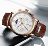 Con su diseño elegante en acero dorado y correa de cuero genuino, combina lujo, fuerza y distinción en un solo accesorio. Además, su dial multifuncional con indicador 24h y fases lunares lo convierte en una joya tecnológica de precisión.
